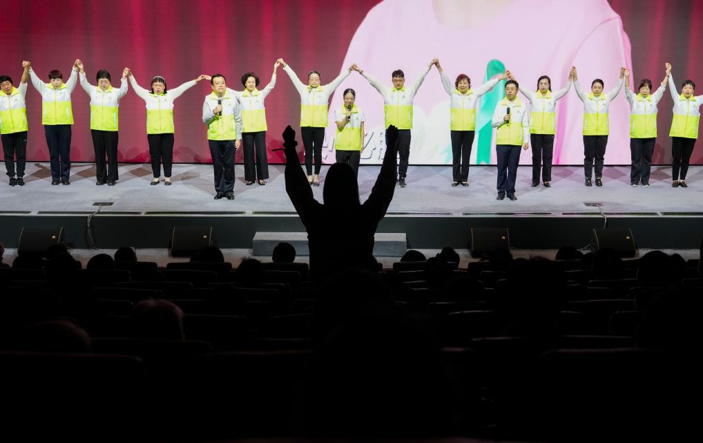 10月10日,在中国残联举办的2025年世界精神卫生日主题宣传活动上,精神障碍康复者、患者家属、医生和志愿者合唱歌曲《同伴》。