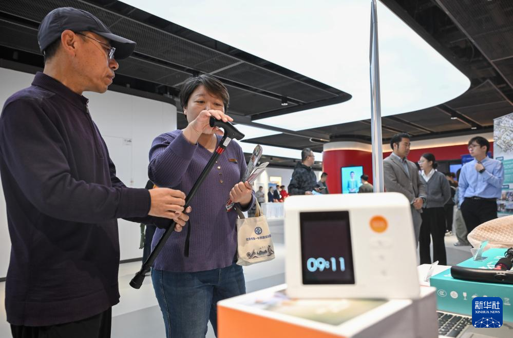 10月25日,市民在“敬老月”主题活动的养老消费季展厅参观一款定位呼叫智能拐杖。
