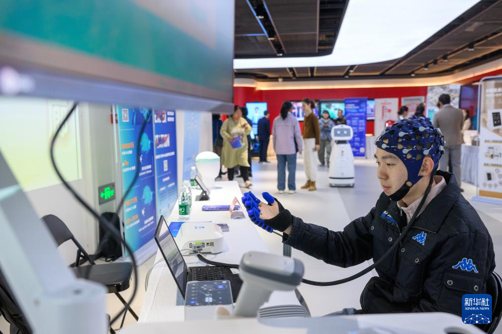 10月25日,工程师在“敬老月”主题活动的养老消费季展厅演示脑机接口手部运动反馈康复训练系统。