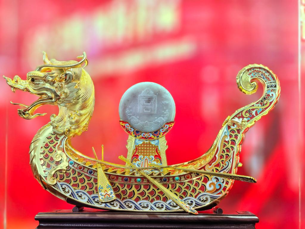 据了解,中国龙之舟设计灵感来源于《龙舟夺标图》,作品以图卷中的龙舟造型为原型进行创作,整体采用花丝镶嵌和景泰蓝工艺制作,气势恢宏、寓意吉祥。