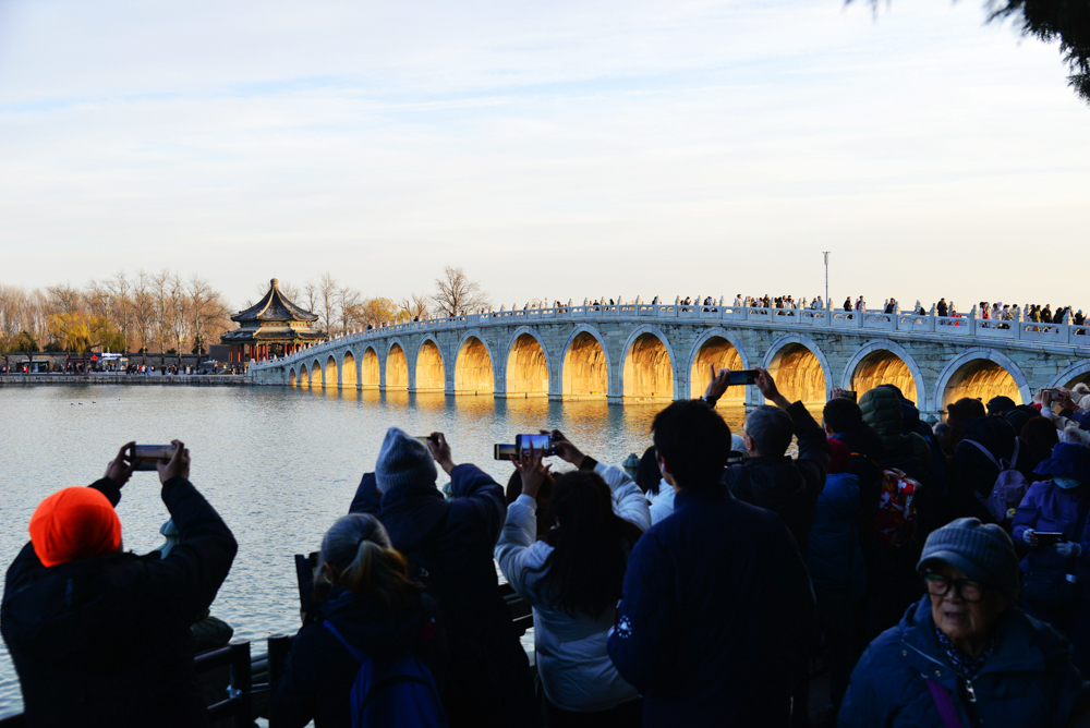 2025年12月1日,北京颐和园十七孔桥上演“金光穿洞”自然景观,吸引游客和摄影爱好者观赏拍照。