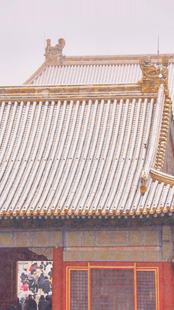 飞雪映朱墙,古城换银装。12日,故宫博物院迎瑞雪!