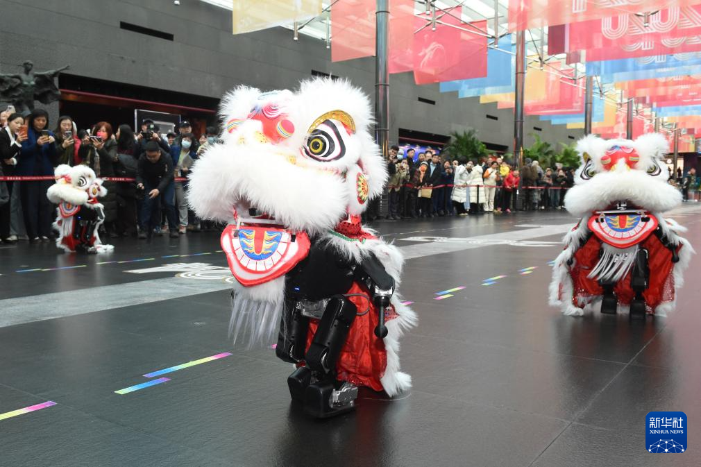 12月22日,机器人在国家大剧院北水下廊道进行“舞狮”表演。