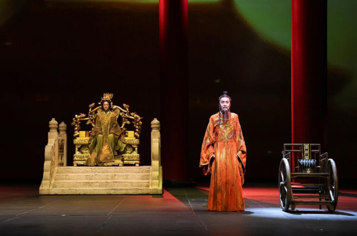 舞台上,灵感来自故宫大殿的八根红色立柱和多媒体影像构建起跨越时间的表演空间,在实与虚、明与暗之间连接现实与想象。不同人物在不同空间交会,从不同侧面展现了角色的内心世界。