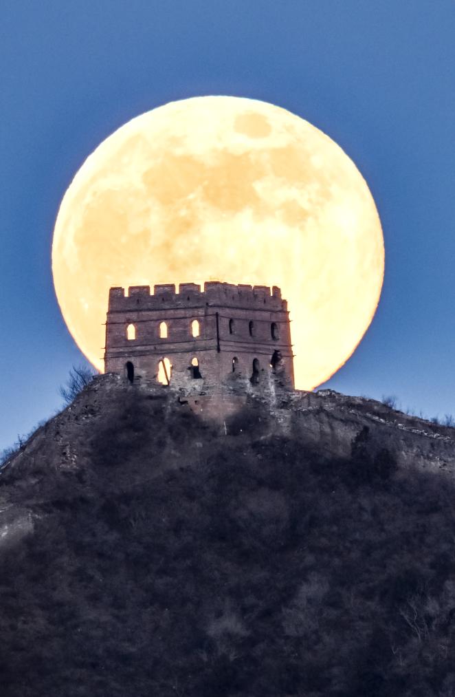 1月3日在北京市密云区古北口镇拍摄的蟠龙山长城二十四眼楼与月亮。