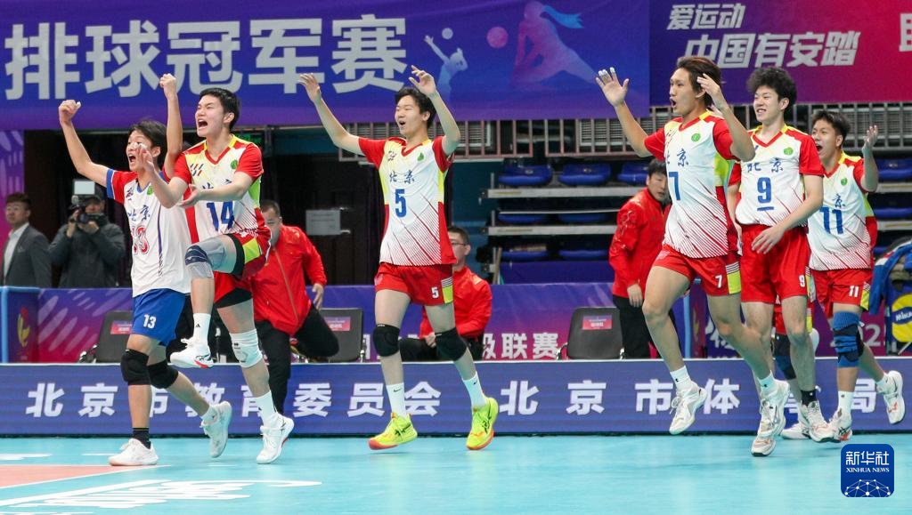 ↑2025年12月28日,北京景山学校队在夺得北京市中小学生排球冠军赛高中男子组冠军后庆祝