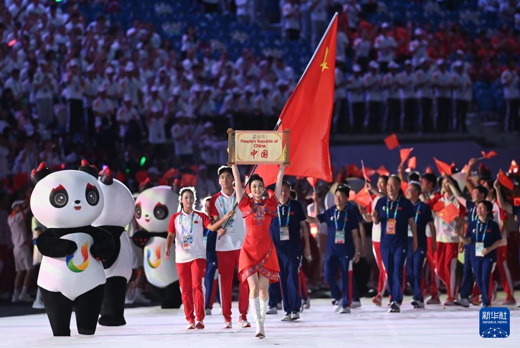 ↑2023年7月28日,中国大学生体育代表团在第31届世界大学生夏季运动会开幕式上入场。新华社记者 王曦 摄