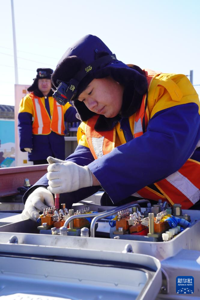 1月20日,中国铁路北京局集团有限公司北京高铁工务段的工作人员在使用轨道检查仪进行作业。