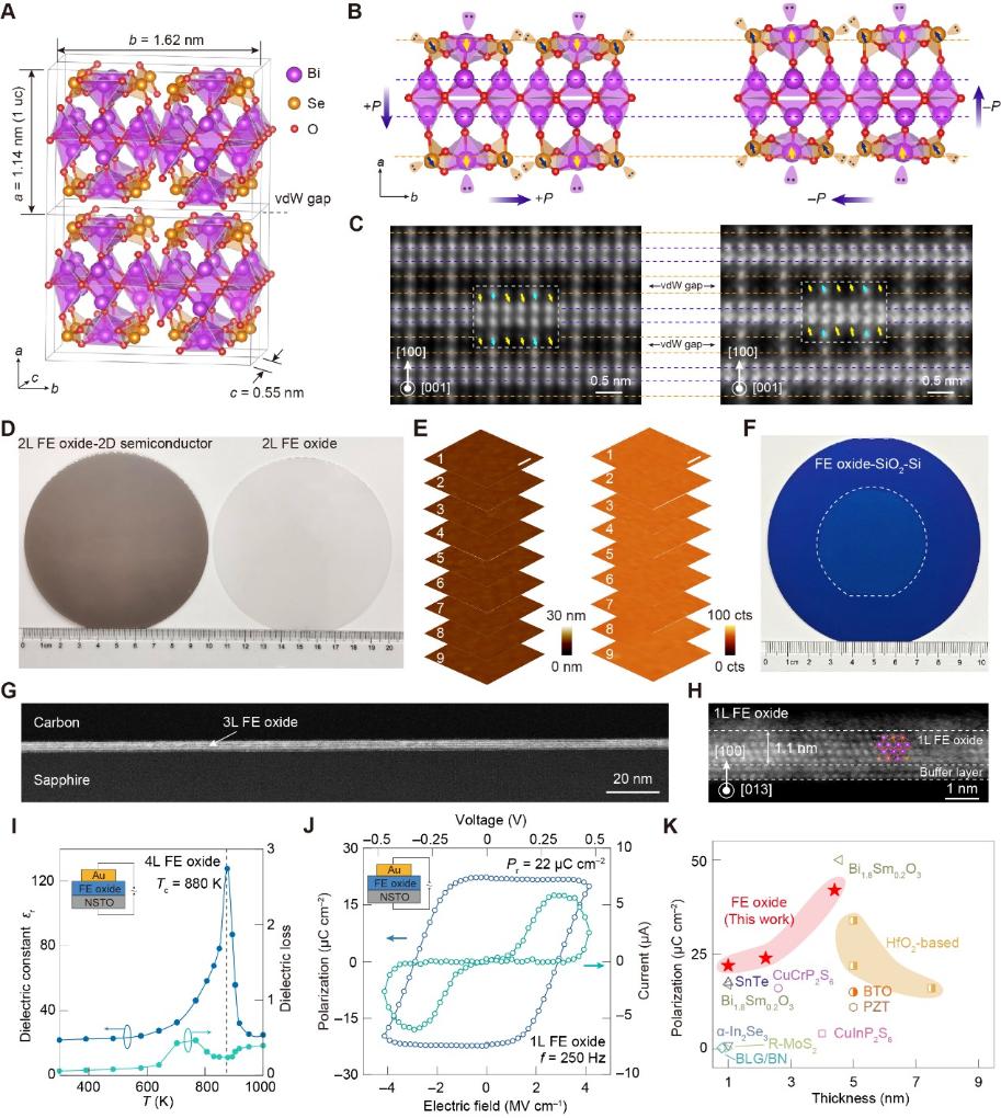 “我们像制作单晶硅片一样,在晶圆上制备出了超薄、均匀的铁电氧化物(α-硒酸铋),更神奇的是,即使薄到仅1纳米(约等于头发丝直径的六万分之一),它依然保有优异的铁电‘记忆’能力,并且‘记忆’层与‘运算’层完美无缝集成,制作工艺能与现有芯片产线兼容。” 彭海琳说。