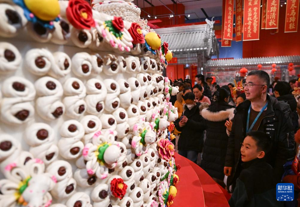 2月15日,观众在“过年——丙午春节系列主题展”上观看陕西非遗代表性项目澄城面花作品“大鼓枣山”。