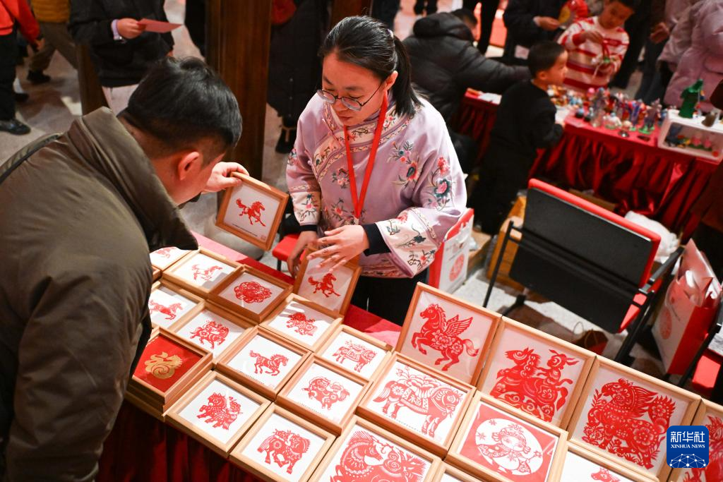 2月15日,观众在“过年——丙午春节系列主题展”上挑选生肖马剪纸作品。