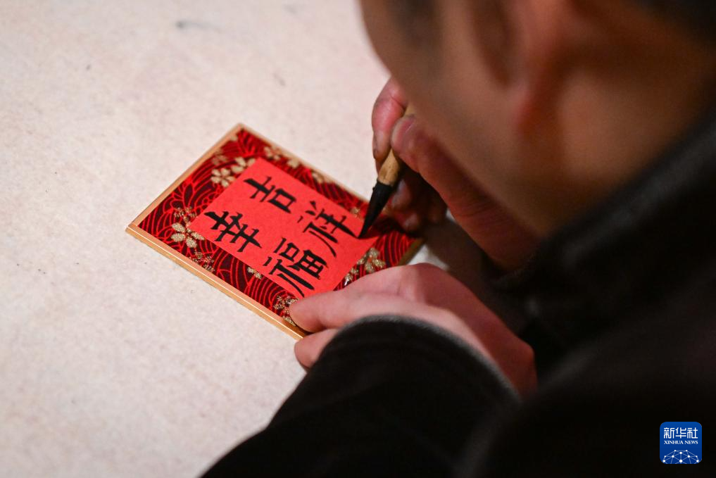 2月15日,在“过年——丙午春节系列主题展”上,工作人员为观众书写祝福语。