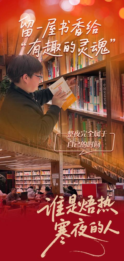 短短一个月,程泽鑫结识了很多“有趣的灵魂”——有一位白天在厨房“颠勺”的“书友”,嫌工作场所嘈杂,静不下心,隔三岔五就来这里“泡”着,一读就是一宿。有一回,程泽鑫见他读得出神,水杯见底,便过去帮他续热水,两人就这么熟识了。