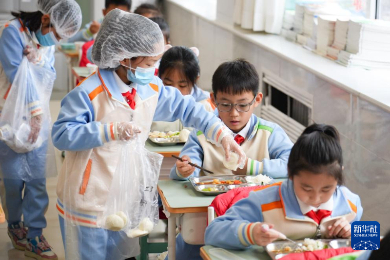 3月2日,首都师范大学附属小学三年级3班分餐员在教室分馒头。