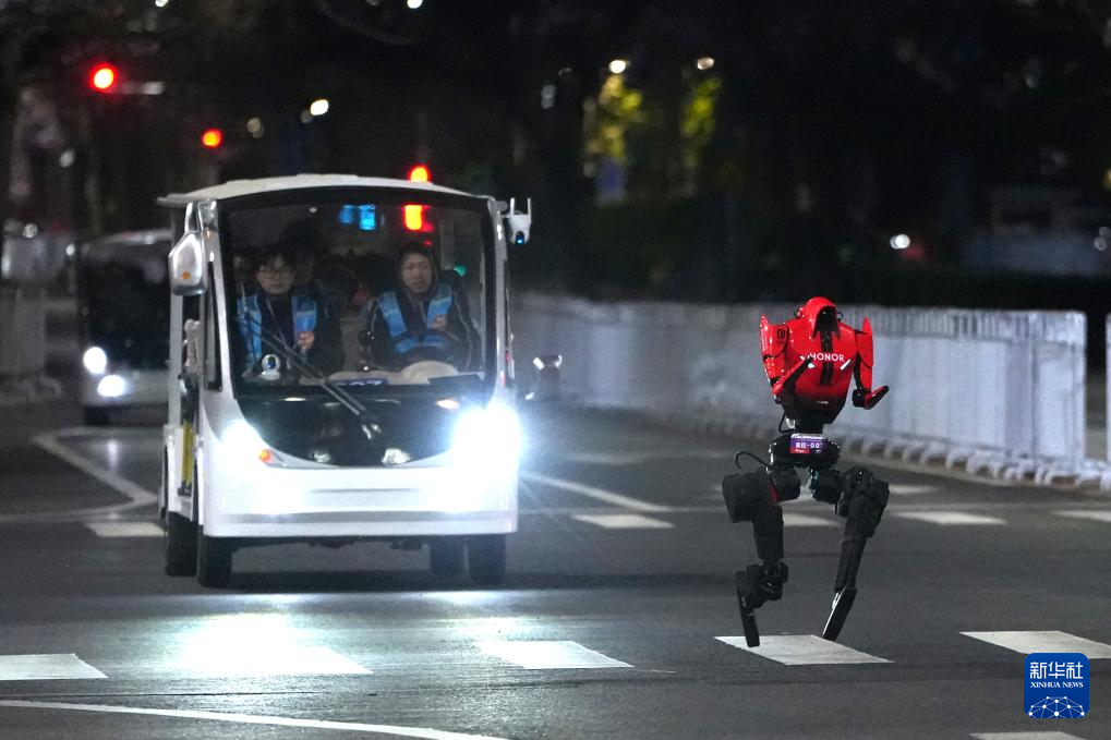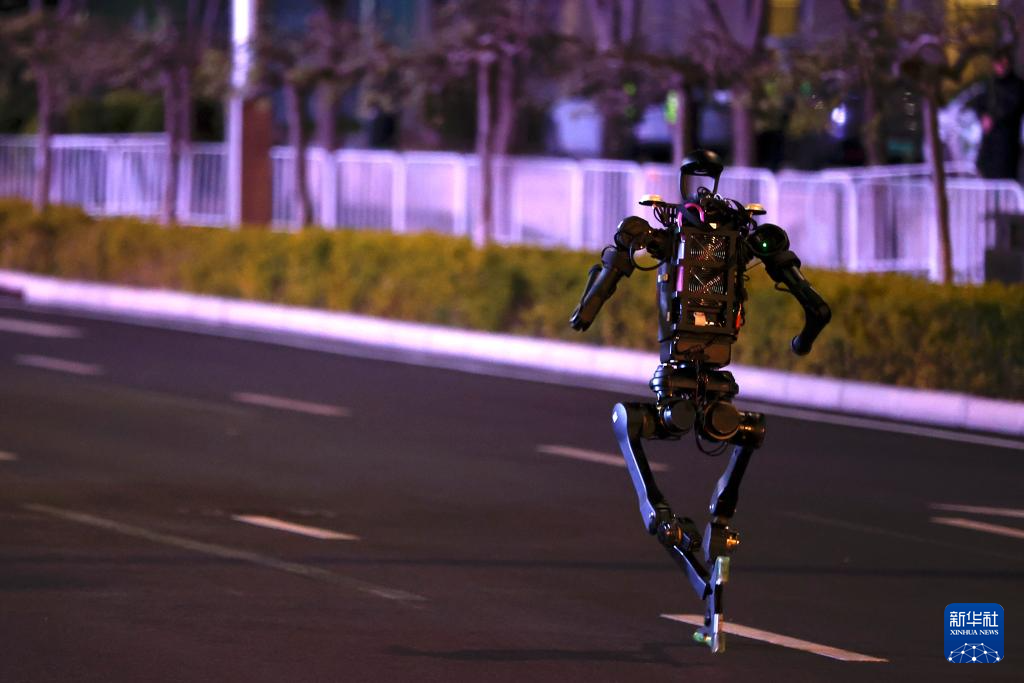 4月11日晚,一台机器人在测试活动中奔跑。 新华社记者 鞠焕宗 摄